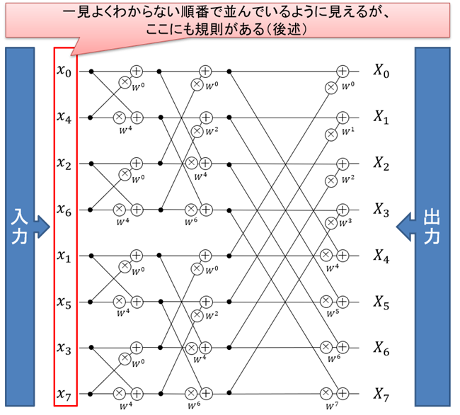 ここまでの図では出力信号が0~7と並ぶように描いているため、入力信号がビットリバーサル順になっています。逆に入力信号の係数が0~7と並ぶように図を書くと、出力(スペクトル関数)側の係数がビットリバーサル順になります。