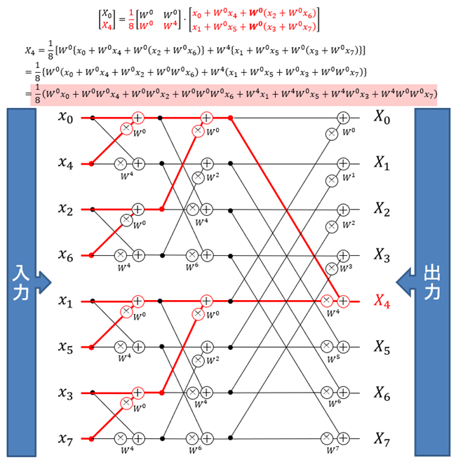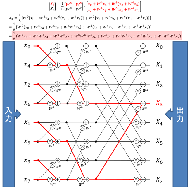 前回の記事で、8点DFT(8×8の回転因子行列)を4つの2×2回転因子行列に分割できるという事を説明しました。その計算過程は、図1のように1枚の絵で表すことができます(ただし先頭の1/Nは省略しています)。
