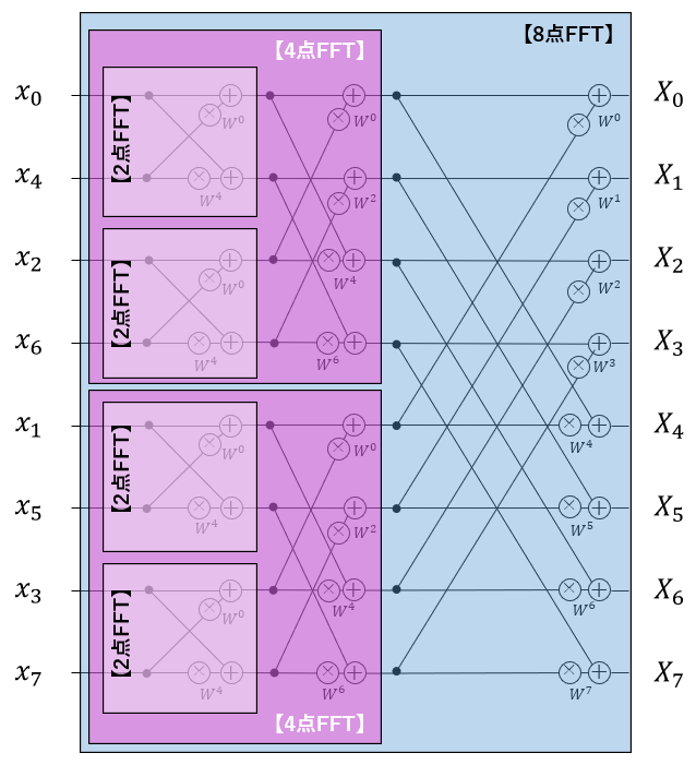 これらは、前回の記事で説明したように8点FFTを2つの4点FFT→4つの2点FFTと分割していく事を意味しています。無駄を省きながら、大きなFFTを2点FFTまで分解して処理を行っているのです(図5)。