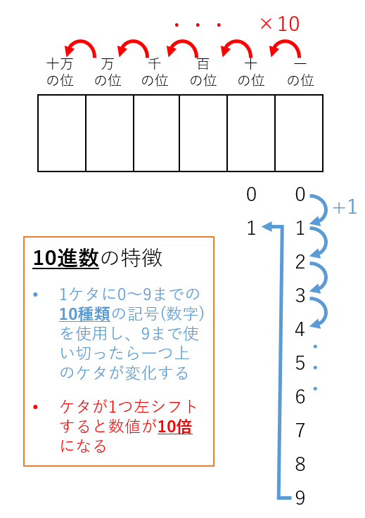 10進数の重要なポイントを図7に示します。1つのケタに0から9までの10種類の記号を(数字)を使用して数値を表示します。0から順に1,2,3…とカウントアップしていき、下位ケタが9まで使い切ると上位(左隣)のケタが1つ増えます。そのため、各ケタは一・十・百・千…と10倍ずつ異なる重みをもちます。小学校の算数で習う「位(くらい)」という概念と同じです。図7下線部に「10」という数値が登場していることに注目して下さい。