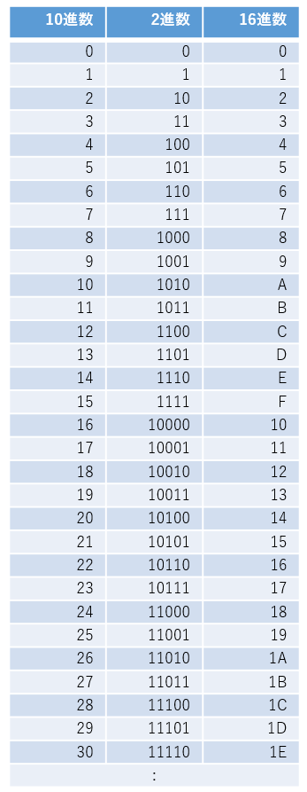 0~30までの整数を10進数・2進数・16進数で表現すると図10のようになります。
